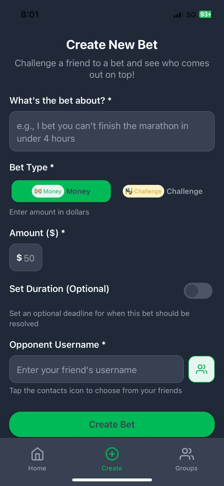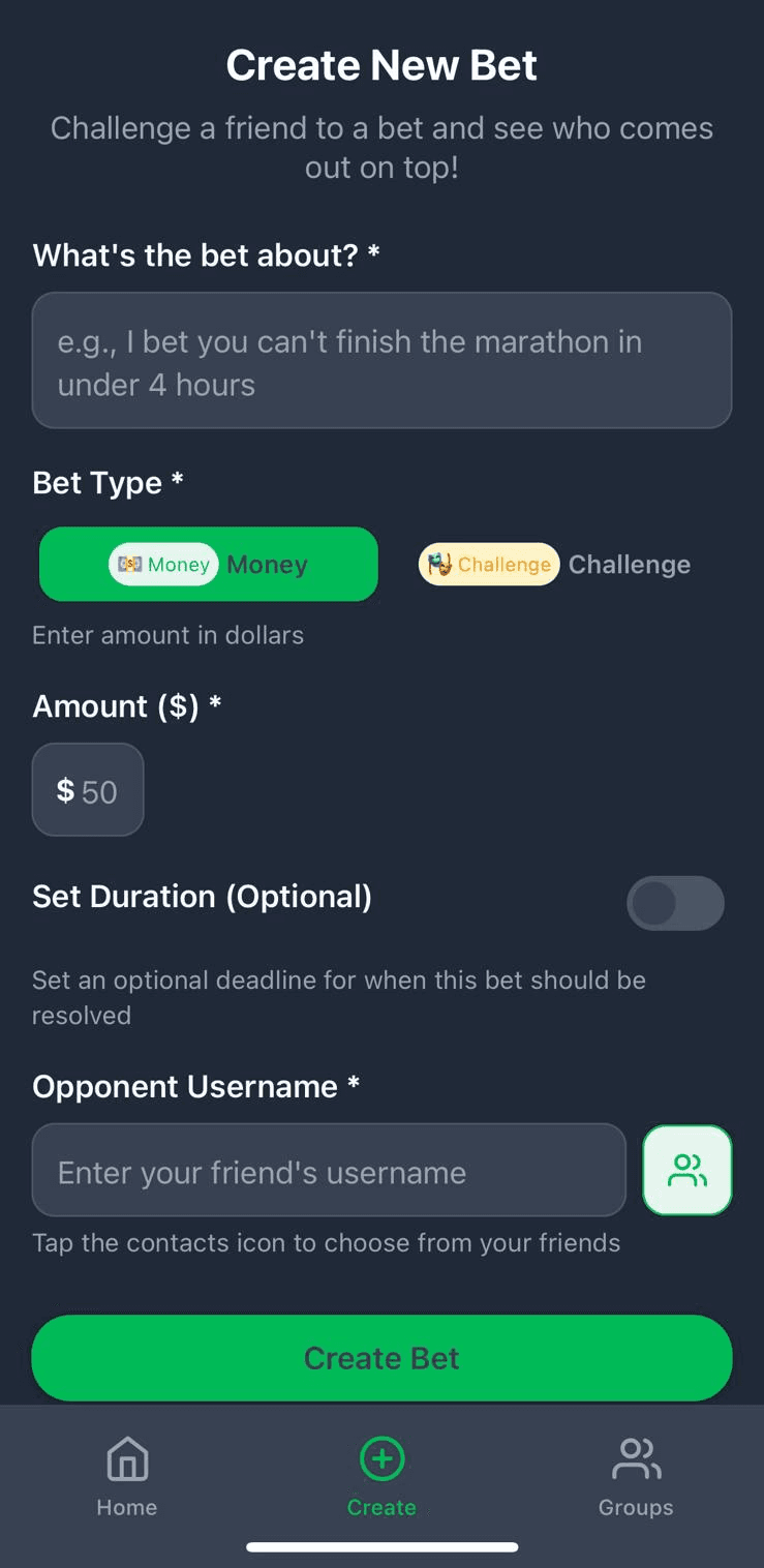 Challenge your friends: Create a playful bet, dare, or challenge with a tap. Choose what’s at stake and set the terms.